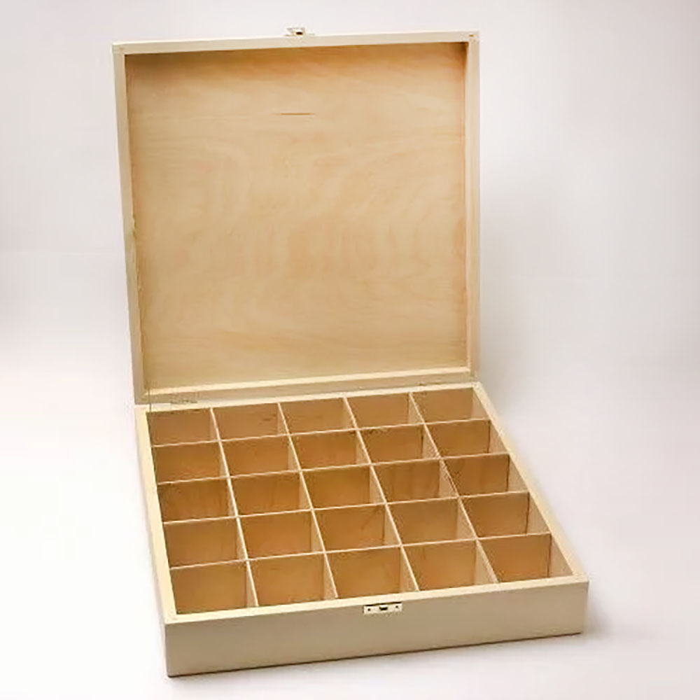 Belseje huszonöt rekeszre osztva,