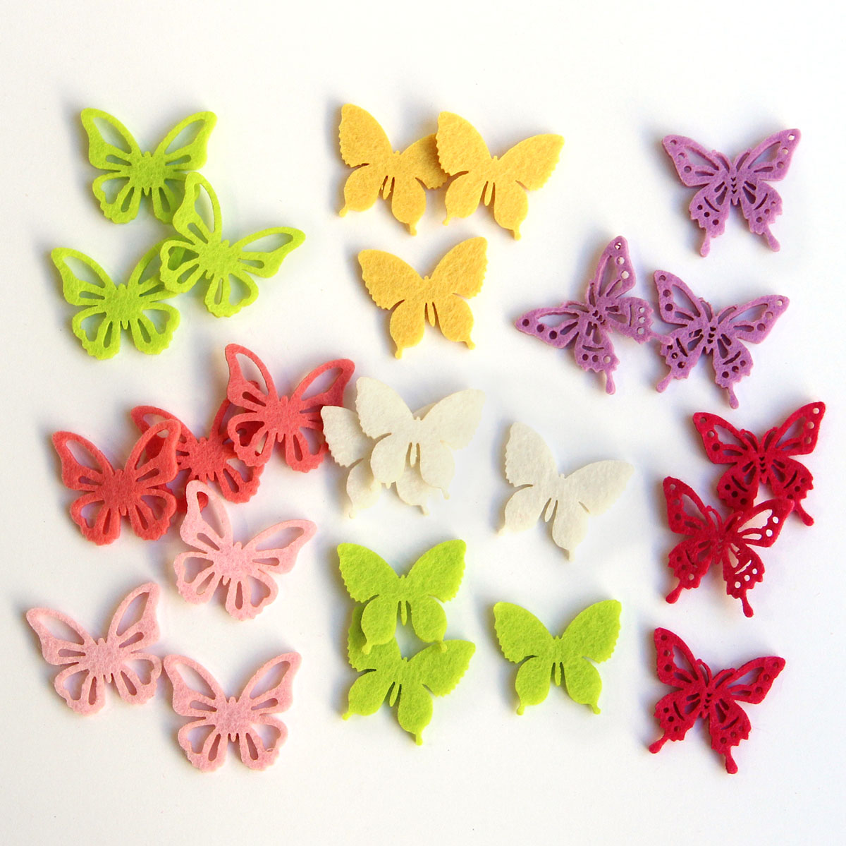 Sárga, zöld, fehér, lila, pink és rózsaszín filcpillangók,