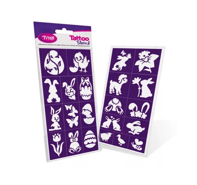 Csillámtetováláshoz öntapadós sablon szett: 22 db különböző minta 2 db 10 x 20 cm-es ív Strapabíró, merev sablon, ami többször felhasználható