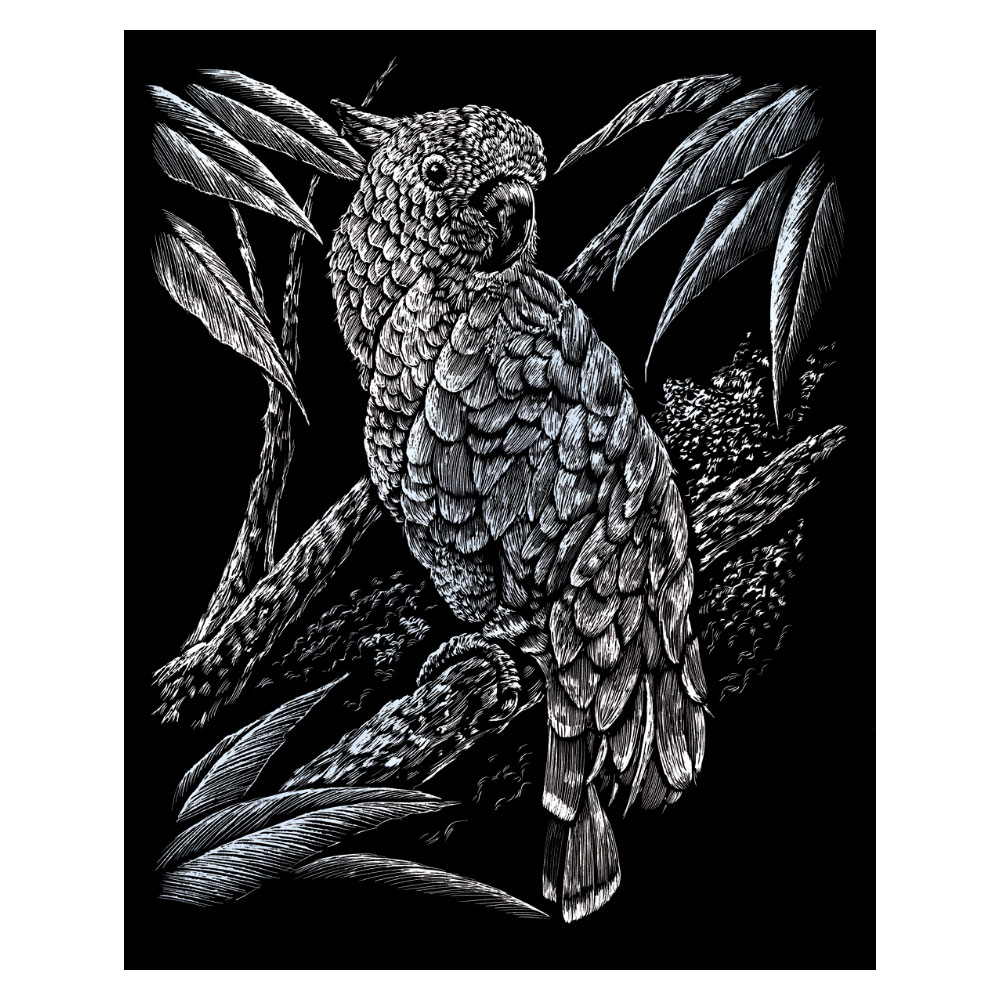 A sötét kartonba karcolt minta, ezüstösen csillog, ha elkészült a kép.