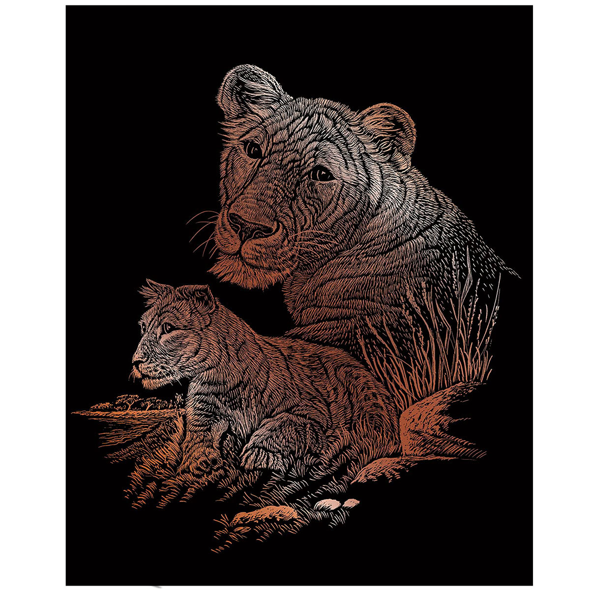 A sötét kartonba karcolt minta, rezesen csillog, ha elkészült a kép.