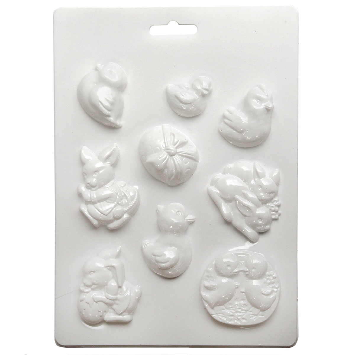 A formából 5 db csibe, 3 db nyuszi, és 1 db hímes tojás forma önthető ki.