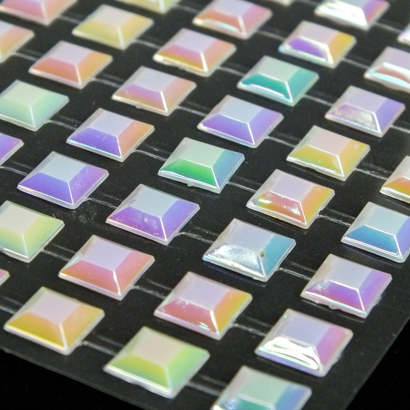Műanyag, fehér színű, gyöngyház csillogású, irizált hatású strasszkövek.