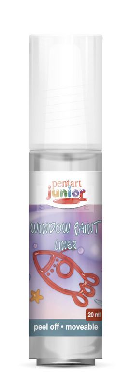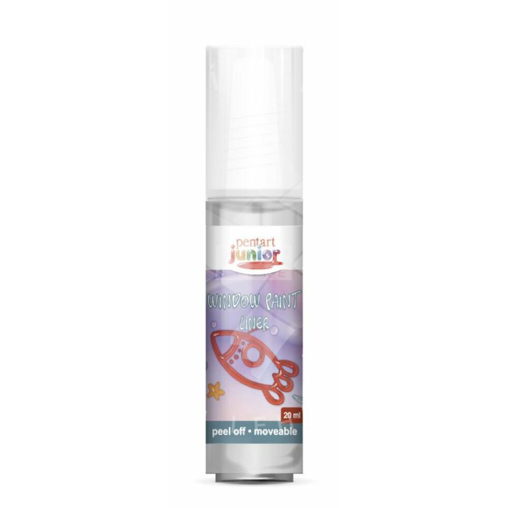 A Pentart Junior lehúzható üvegfestékekkel ablakra, tükörre vagy más sima felületre készíthetünk alkalmi dekorációkat, melyeket később könnyen eltávolíthatunk onnan. Kétféle kiszerelésben (20ml és 80ml), ötféle kontúrszínben és 13 féle kitöltő színben kapható.