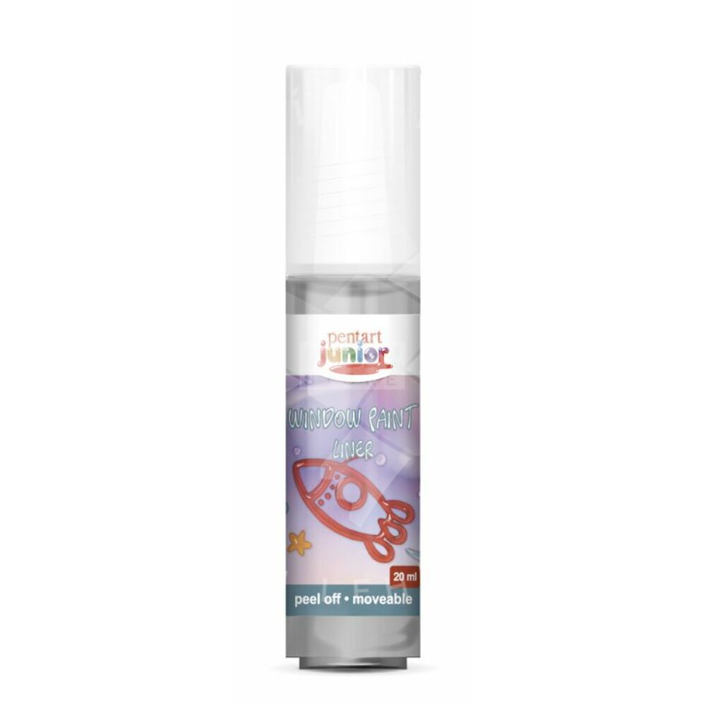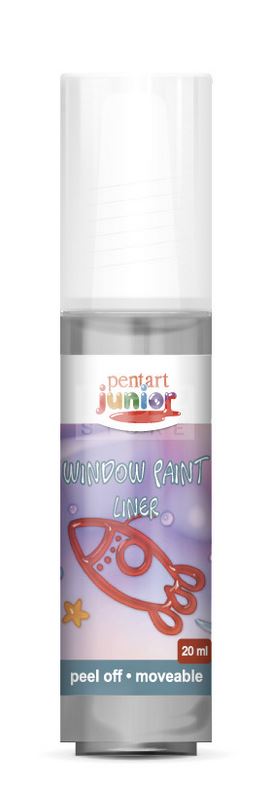 A Pentart Junior lehúzható üvegfestékekkel ablakra, tükörre vagy más sima felületre készíthetünk alkalmi dekorációkat, melyeket később könnyen eltávolíthatunk onnan. Kétféle kiszerelésben (20ml és 80ml), ötféle kontúrszínben és 13 féle kitöltő színben kapható.