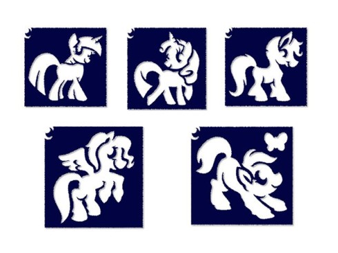 A csomagban található sablonok segítségével pónilovas csillámtetoválás mintákat készíthetsz, melyeket egyéb testfestéshez is felhasználhatsz.
