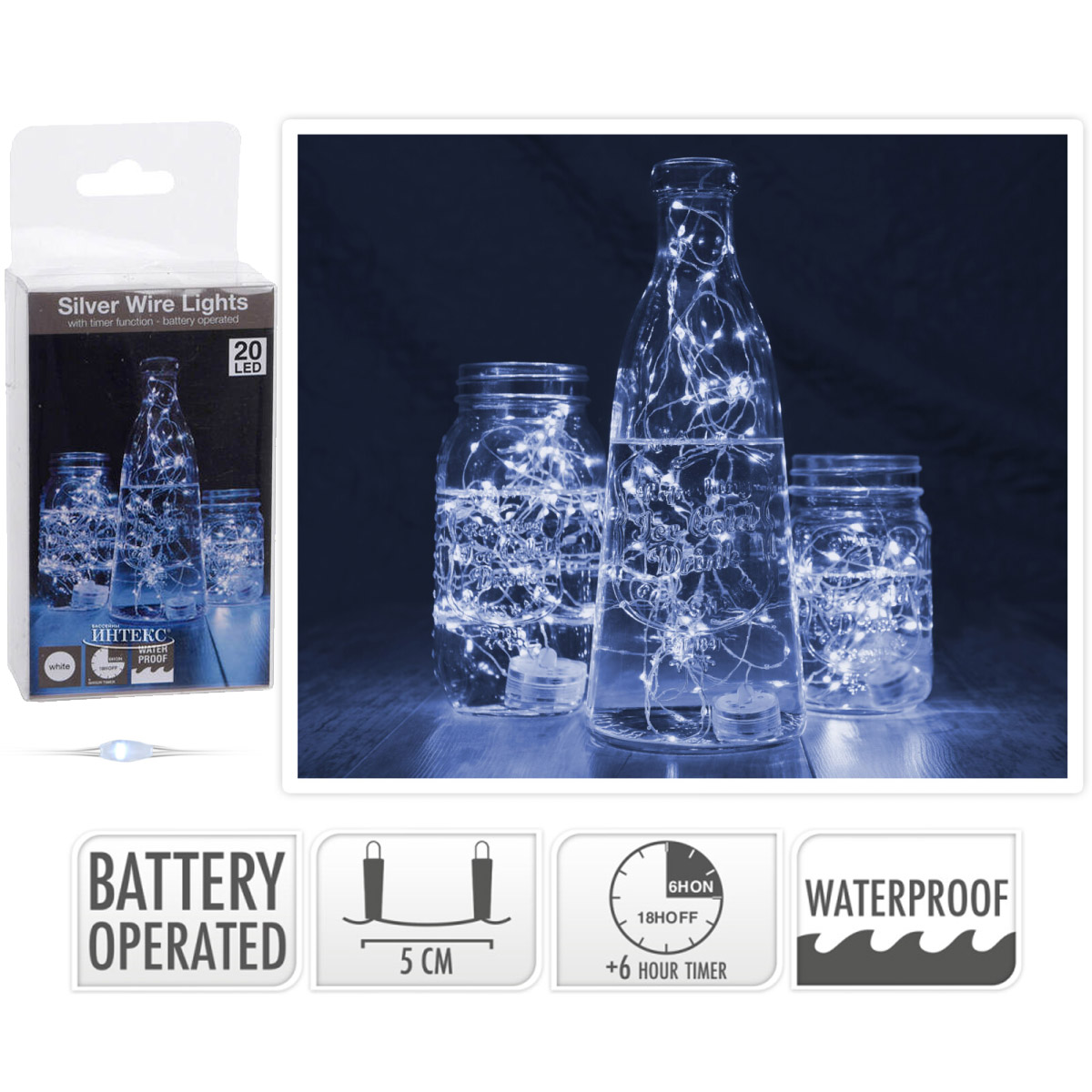 Silver Wire vízálló fényfüzér, 20 leddel időzítős, fehér fényű 1m