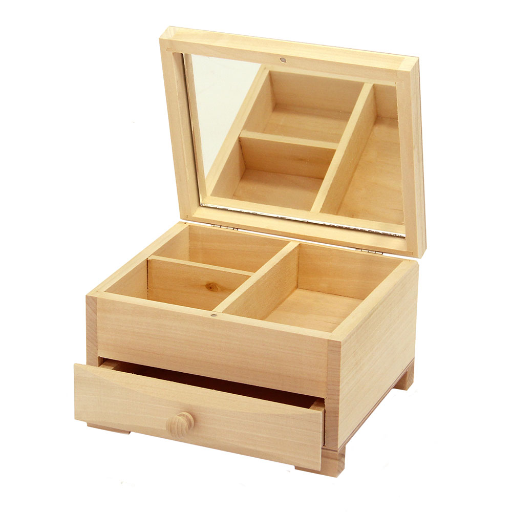 Natúr fa ékszertartó tükrös doboz, fiókkal.